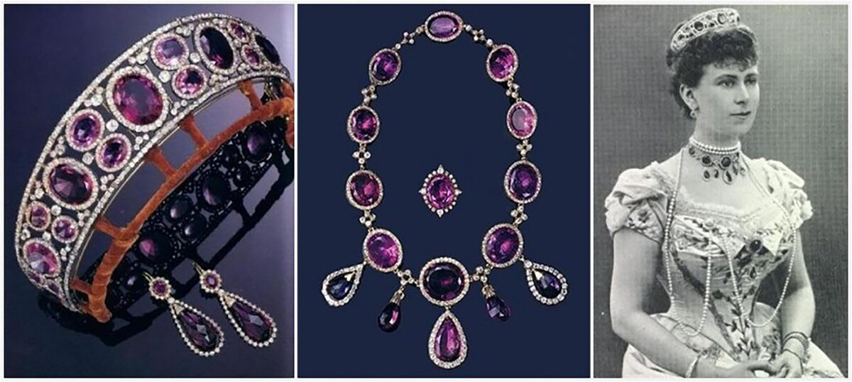 Ciekawa jest historia Amethyst Parure (tiary, naszyjnika, kolczyków i pierścionka) angielskiej królowej Marii.