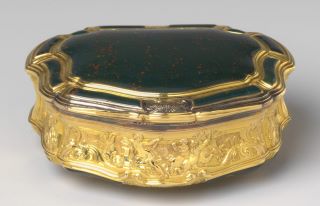 A German snuffbox, ca 1740, made from bloodstone and gold. 3.8 x 8.3 x 6.4 cm. Gift of Mrs. Charles Wrightsman, 2008. Metropolitan Museum of Art, New York. Public Domain. (Cropped to show detail).