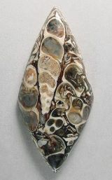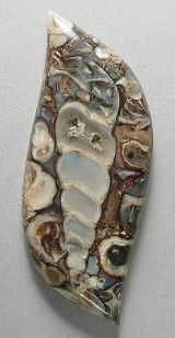Naprzemienne pasma półprzezroczystego Agatu i skamieniałych muszli ślimaków przyczyniają się do wyjątkowego waloru estetycznego agatu Turritella.