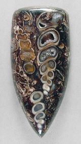 Skamieniałe muszle ślimaków Turritella w Agacie są zazwyczaj ciemnobrązowe lub czarne, tworząc uderzający kontrast z jaśniejszym tłem Agatu.