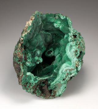 Malachite występuje zazwyczaj w postaci groniastych lub inkrustowanych mas, często o promienistej, włóknistej strukturze i pasami w różnych odcieniach zieleni.