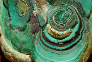 Malachit Uralski tworzy niezwykle piękny, fantazyjny wzór wydłużonych półpierścieni, półkul i spiekanych pasów.