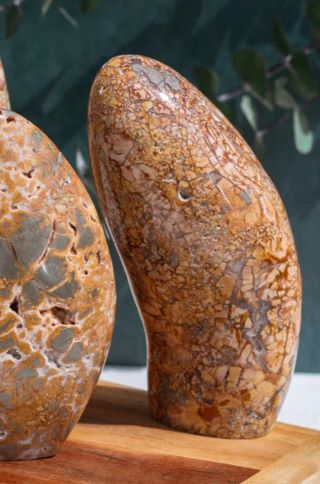 To kamień złożony z kanciastych kawałków Jaspisu, połączonych ze sobą kwarcem, tworząc kolorowy, połamany i złożony na nowo wzór.