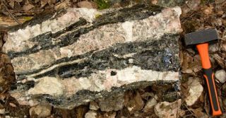 Pegmatite in which the main ingredients are biotite mica (black), microcline (pink), oligoclase (white), and quartz (gray). The rock has a monzogranitic composition. Evje, Norway. From Sand Atlas.