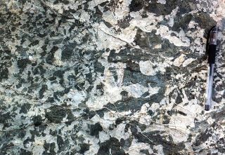 Gabbroic pegmatite from Cyprus. White is plagioclase, black is pyroxene. From Sand Atlas.