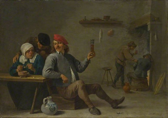 A Man holding a Glass and an Old Woman lighting a Pipe
