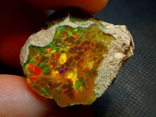 Ta odmiana Opalu Etiopskiego ma złocistą barwę bazową z delikatnymi inkluzjami, które tworzą wzory przypominające plastry miodu lub płatki śniegu.