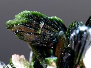 Sporadyczne skupiska ostrych, igiełkowatych kryształów tworzą mały, oliwkowozielony las.