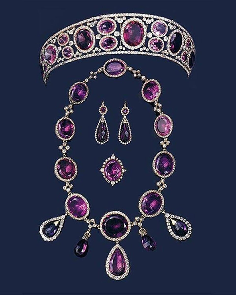 Ciekawa jest historia Amethyst Parure (tiary, naszyjnika, kolczyków i pierścionka) angielskiej królowej Marii.