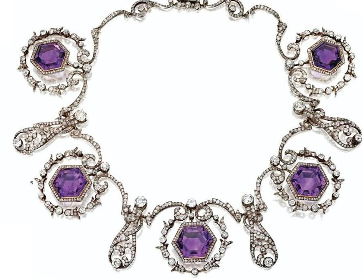 Biżuteria z Amethyst i Brylantami mogła być noszona jako Naszyjnik lub Tiara, jeśli została umieszczona na specjalnej podstawie.