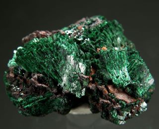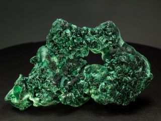 Malachite występuje zazwyczaj w postaci groniastych lub inkrustowanych mas, często o promienistej, włóknistej strukturze i pasami w różnych odcieniach zieleni.
