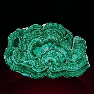 Malachit Uralski tworzy niezwykle piękny, fantazyjny wzór wydłużonych półpierścieni, półkul i spiekanych pasów.