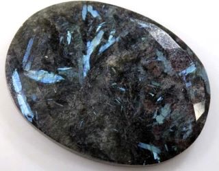 Jednak kamień jest ceniony za niezwykłe inkluzje - żółte, złote, zielone, niebieskie, czerwone i fioletowe, które tworzą opalizujące przelewy - efekt opalizacji . Dlatego najczęściej Nuummite są polerowane w kaboszony, aby rozjaśnić tę szczególną tęczową grę światła.