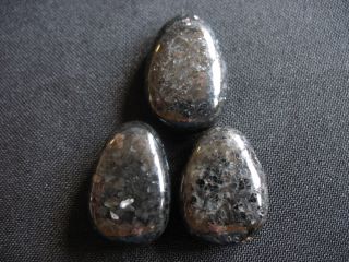 Kaboszony Nuummite są starannie kształtowane i polerowane, aby podkreślić unikalne wzory i iryzację kamienia.