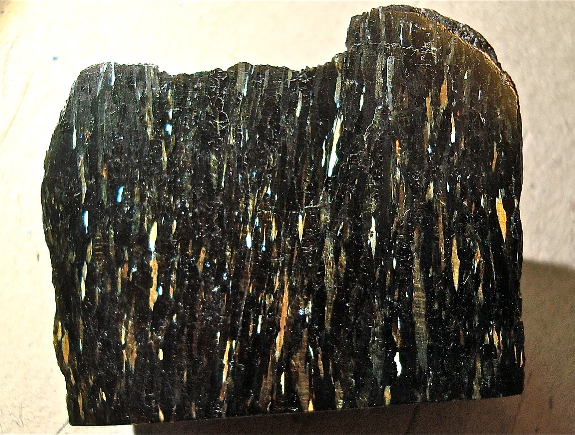 Ta odmiana Nuummite wyróżnia się dominującymi złotymi tonami.