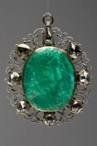 Chalcedon, oprawiony w złoto z emalią, rubinami, szmaragdami, diamentem i perłą