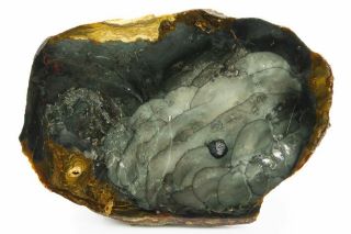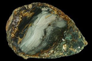 Okaz jaspisu Obrazkowego Blue Mountain można rozpoznać po ciemnym, niebiesko-czarnym rdzeniu, często otoczonym beżowymi i zielonymi pasami.